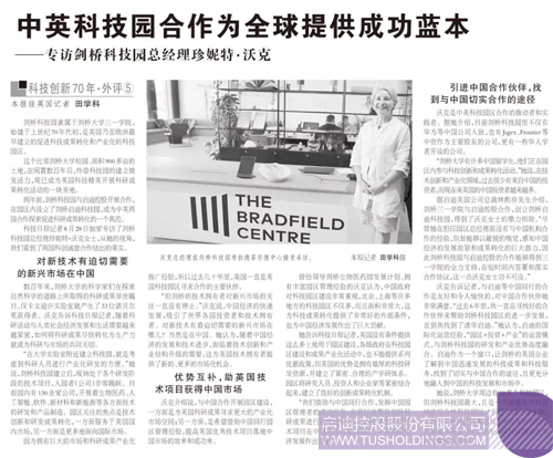 9月4日,科技日報《科技創新70年》專訪劍橋科技園總經理珍妮特·沃克 ,以下為報道全文: