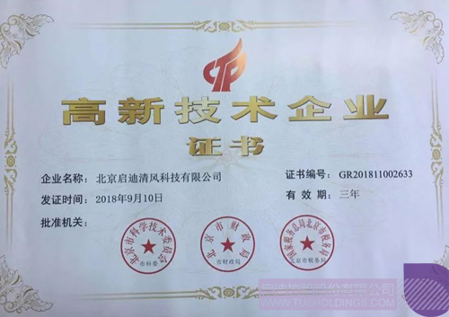 2018年9月,啟迪清風榮獲北京市科學技術委員會、北京市財政局、北京市稅務局頒發的“高新技術企業證書”。